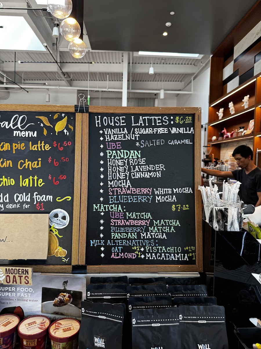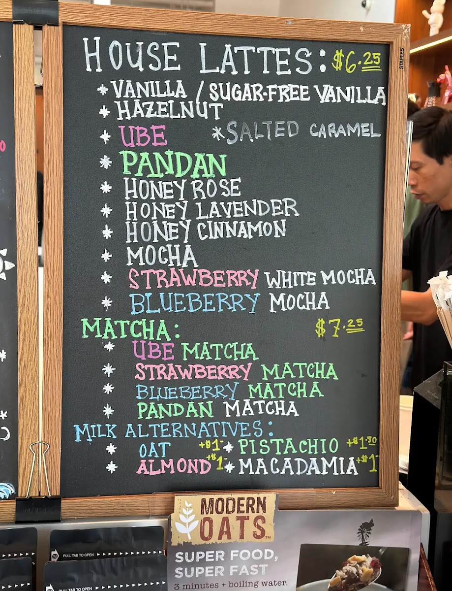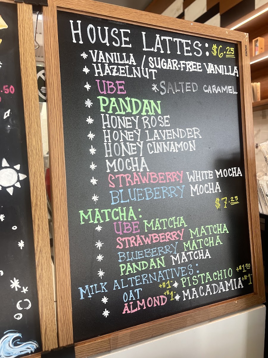 The menu features a variety of coffee and beverage options, including specialty lattes such as Ube Latte, Pandan Latte, and Blueberry Matcha, alongside classic choices like Iced Coffee and Cortado. For those preferring non-coffee options, steamers like Hot Chocolate are available.
