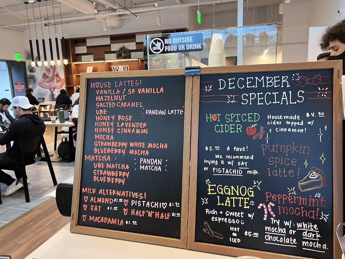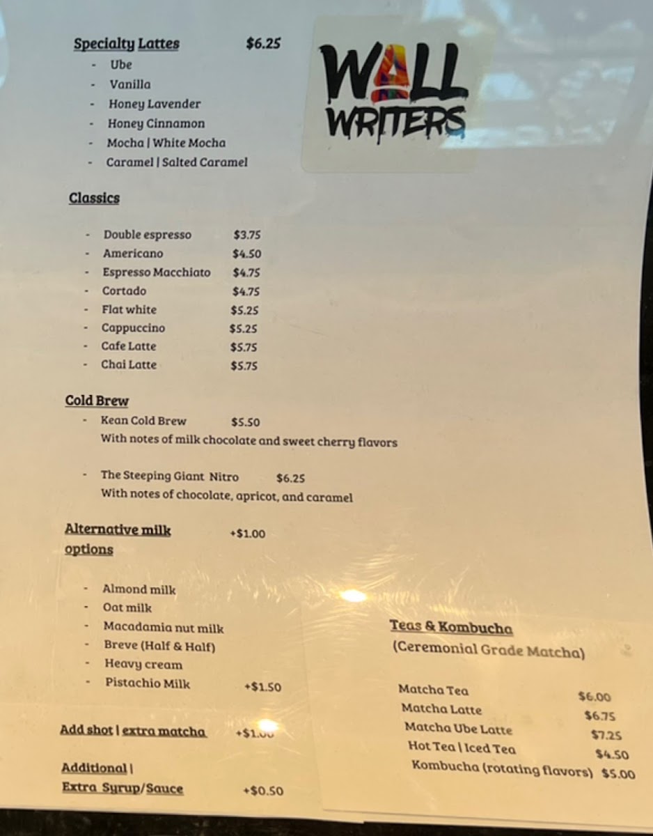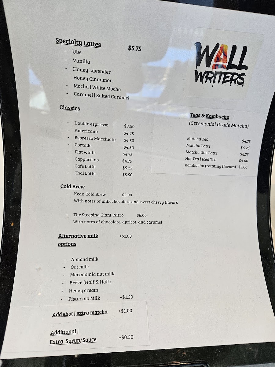 The menu features a variety of coffee and beverage options, including specialty lattes such as Ube Latte, Pandan Latte, and Blueberry Matcha, alongside classic choices like Iced Coffee and Cortado. For those preferring non-coffee options, steamers like Hot Chocolate are available.