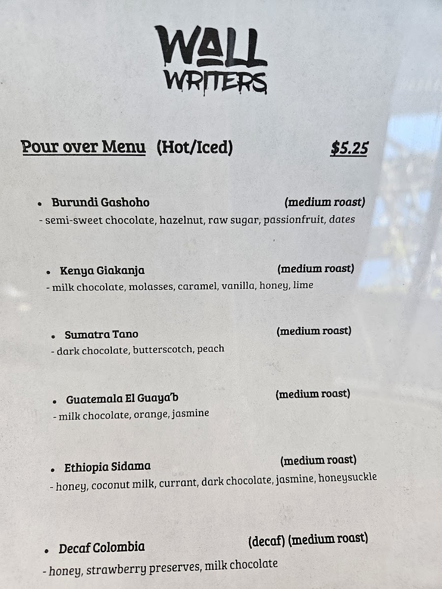 In addition to drinks, the menu includes a selection of fresh pastries and light food items suitable for breakfast or a light meal. Pastries such as Choc Croissant and Blueberry Muffin complement the beverage offerings.
